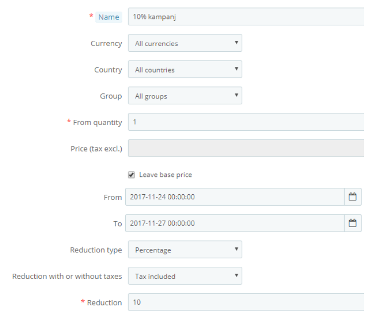 Här kommer vi direkt in till skapandet av regeln - den första rubriken finns där för att vi ska kunna hålla koll på de kampanjer vi kör just nu. På samma sätt som den andra rabattypen så kan man villkora denna rabatt kopplat till länder och kundgrupper. Som regel gör man inte det men möjligheten finns. Här ställer vi in From - To som givetvis är giltighetstiden. Valet under heter "Reduction type" vilket ger oss möjlighet att välja om vi vill reducera pris med kronor eller med procent på nästföljande steg får vi alternativet om rabatten ska appliceras inkl. eller exkl. moms. Som regel ska här väljas inkl. moms. (Tax included).