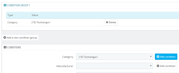 Här får vi möjlighet att välja vilken kategori som vara rabatterad genom att välja vår kategori och därefter trycka på Add condition. När vi har gjort det så hoppar det valet upp en nivå och indikerar att rabatten kommer appliceras på denna kategori. Observera att detta kommer ge rabatter på enbart de artiklar som ligger direkt i denna kategori. Om man har flera kategorier (eller underkategorier) som ska ha rabatt måste man skapa flera "Condition groups" genom att trycka på "Add a new condition group" igen och repetera detta steg.
