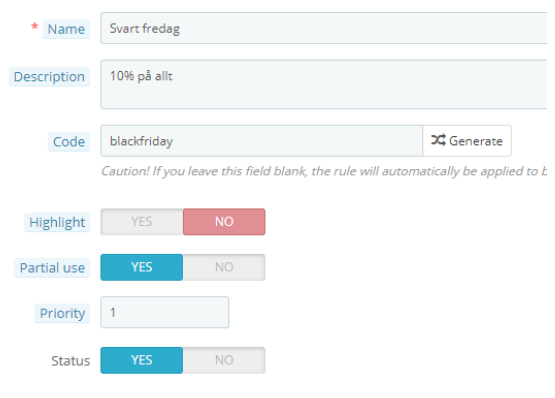 Om man skapar en kampanjkod och inte skriver in någon kod (code) så gäller rabattkoden för alla som uppfyller villkoret för rabattkoden.