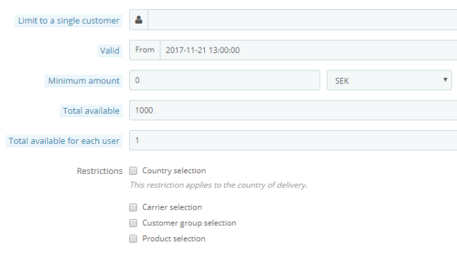Nästa steg är att ställa in vilka villkor som ska gälla för kampanjkoden. Detta gör man under Conditions. Här ställer man in vilka villkor som ska gälla för kampanjen. Man kan dels välja en specifik kund, tala om hur länge kampanjen ska vara giltig samt villkora att man ska handla för en viss summa. De alternativ vi har valt att fylla i, i det här fallet är "Total available" där vi talar om att det totalt ska gå att använda kampanjkoden 1000 gånger. I fältet nedanför talar vi om hur många gånger varje specifik kund ska kunna använda kampanjkoden i vårt fall bara 1 gång. Här skulle vi också kunna välja specifikt vilka produkter/kategorier som kampanjen ska gälla. Detta gör man genom att bocka i Product selection och därefter skapar man så många regler för kategorier/produkter som man vill.