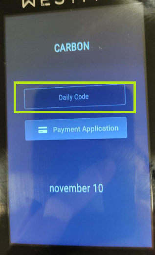 När samtliga appar är stängda möts man av "Carbon"-startskärmen Tryck på valfri tom plats mitt på skärmen och två funktionsknappar uppkommer. "Daily code" och "Payment Application".