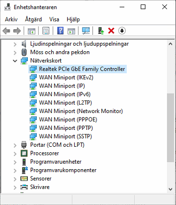 Det finns alldeles för många modeller av nätverkskort för att lista alla här. I bilden ovan heter det Realtek PCIe GbE Family Controller. Dubbelklicka på nätverkskortet för att öppna egenskaper. Går även bra att högerklicka för att komma åt det.