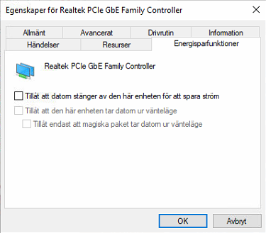 Välj fliken Energisparfunktioner (Power Management) och avmarkera alla alternativ enligt bilden nedan.