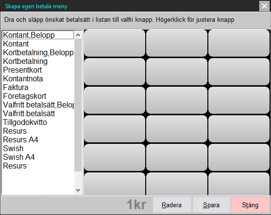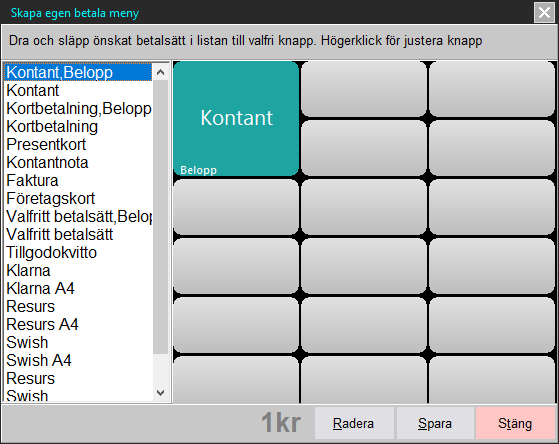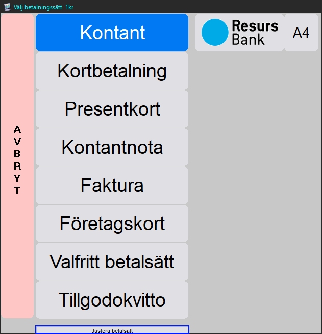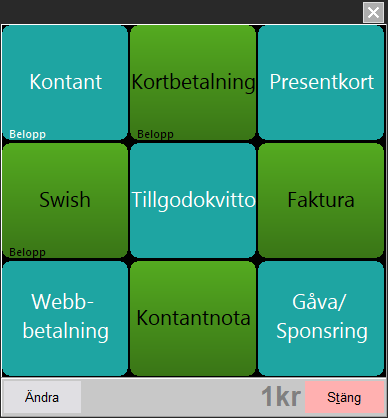 Betalakondimentet som är standard i kassan är relativt statisk och det enda man kan ändra på denna är namnet för Valfritt betalsätt samt att om man har Resurs eller Swish integrerat i kassan så visas dessa med. Men det finns en lösning för att själv kunna få de betalsätt som behövs just för er verksamhet. Nedan följer en guide för hur man gör detta.