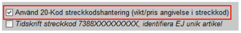 För pris i streckkod Gå till: Arkiv/Inställningar/Systemuppgifter/Standardvärden/Artikelregister Markera: Använd 20-kod, starta om pckassa. Ta bort enhet på artikeln. Klistra in en streckkod med pris i sig och tryck enter. Nu genereras rätt kod för artikeln. Spara, stäng.