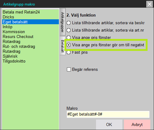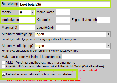 Säkerställ att kryssrutan "Betraktas som betalsätt och omsättningsbefriad" är markerad.