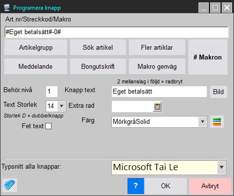 Ange beskrivning på betalsättet. Ange även eventuellt redovisningskonto i fältet "Intäktskonto" som betalsättet ska belasta i eventuella redovisningsfiler (då det är ett betalsätt fyller man inte i konto för moms). Tänk gärna till om namnet. Detta kommer nämligen att synas på kvittot till kunden. Nedan används beskrivningen Eget betalsätt. Du skriver så klart den beskrivning som passar er.