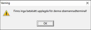 Relaterat felmeddelande till detta är: Finns inga betalsätt upplagda för denna obemannade terminal.
