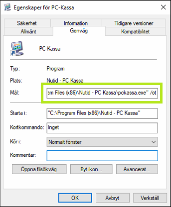 Högerklicka på genvägen till kassaprogrammet och lägg till växeln efter pckassa.exe-sökvägen under fältet "Mål".
