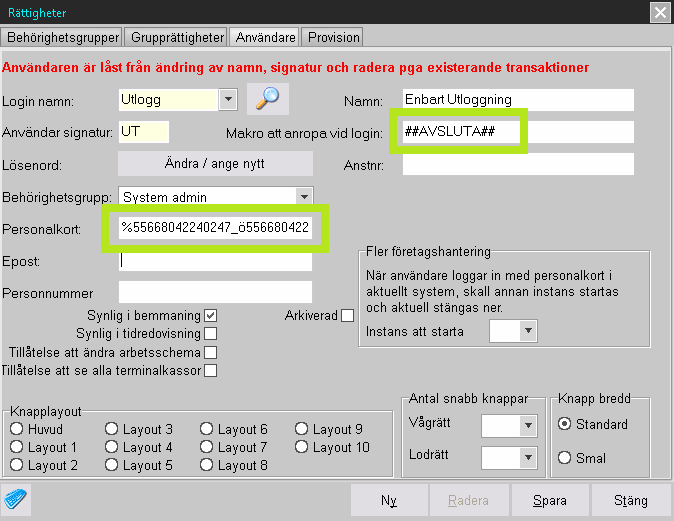 Tips är att sätta ett eget personalkort som enbart används för utloggning av kassan. På detta sätt är det mycket enkelt för personalen att ha ett "utloggningskort" till OT-kassan. För detta skapa en användare kopplad till personalkort och ange att anropa makro vid inlogg - ##AVSLUTA##.