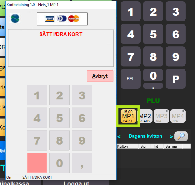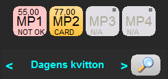 Om en kund däremot inte använder terminalen på en minut kommer transaktionen att avbrytas och knappen övergår till en röd färg med texten "NOT OK". På samma sätt fungerar det ifall kunden manuellt stoppar beloppet i terminalen eller av annan anledning avbryter köpet, knappen övergår då också till rött och signalerar köpet som "NOT OK". Om detta sker går det bra att trycka på MP-knappen igen för att hämta upp kvittot och göra ett nytt försök. Om det upphämtade kvittot rensas ut likt med "F1 NY"-knappen kommer det sparas som ett parkerat kvitto och hanteras därefter manuellt från de parkerade kvittona vid behov.