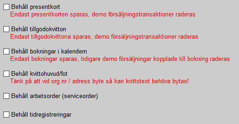 Undersök också med kunden och föranmäl redan vid beställningen ifall presentkort eller annat ska behållas i databasen från gamla ägaren över till den nya ägaren. Tänkt dock på att bland annat dessa historiskt laddade presentkort manuellt måste hanteras samt bokföras av nya ägaren då ingen transaktion för försäljningen av dessa finns i den tillträdande kundens kassa. Detta är mycket viktigt att informera kunden om. Det man får möjlighet att behålla vid bytet är enligt bilden nedanför.
