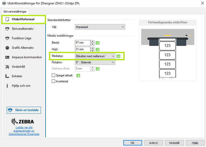 - Zebra ZD421D - Ändra hur skrivaren hanterar avskiljemarkering