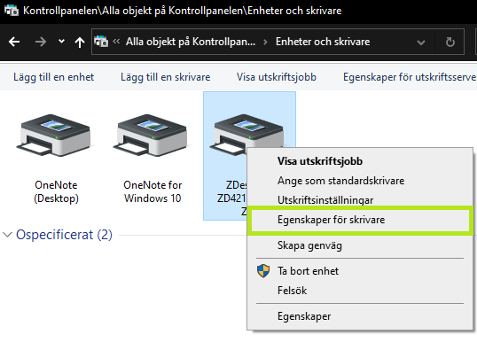 Högerklicka sedan på etikettskrivaren ZD421 och fälj menyn "Egenskaper för skrivare".