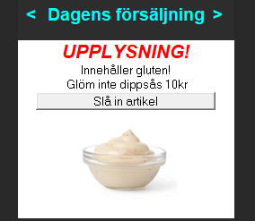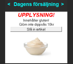 I exemplet är, utöver informationsmeddelandet, artikeln "Dippsås 10kr" kopplad till upplysningen på artikeln "Pastasallad - Kyckling" och även en bild för att det ska bli ännu tydligare vad budskapet avser.