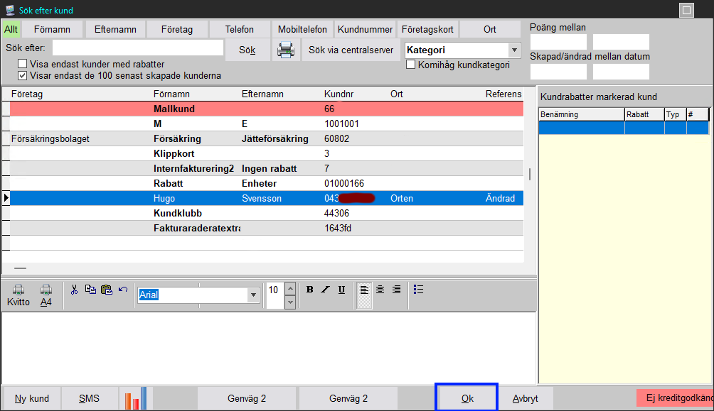Välj kund och tryck på "OK" nere till höger eller skapa en ny kund med knappen "Ny kund" nere till vänster.