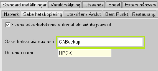 Generellt sparas säkerhetskopiorna i sökvägen "C:\Backup" men detta kan variera beroende på era lokala inställningar. För att lokalisera mappen där säkerhetskopiorna finns, öppna inställningsmenyn i kassaprogrammet via Arkiv - Inställningar - Systemuppgifter och välj fliken "Säkerhetskopiering" i den nedre raden.