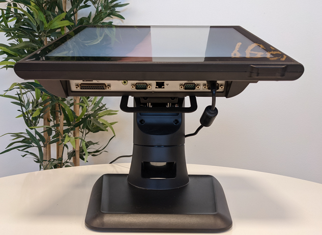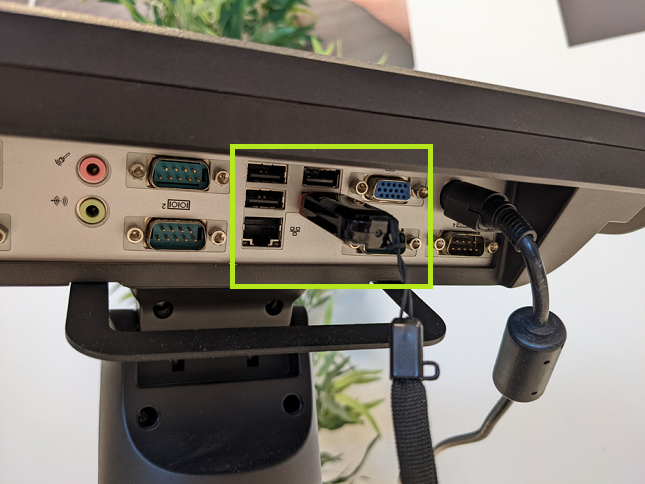 Anslut ett USB-minne eller en extern hårddisk i en ledig USB-port. Om det inte finns några lediga USB-portar på sidan av skärmen eller foten av kassadatorn nås de oftast på undersidan av skärmen. Vinkla skärmen försiktigt så att det går att komma åt en ledig USB-port.