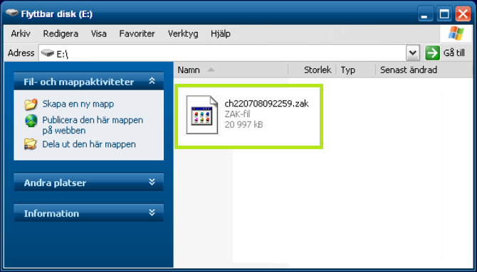 Högerklicka (eller håll inne fingret) på den fil som skapades alldeles nyss. (Filen kan vara "Typ" BAK-fil eller ZAK-fil med ett "Namn" likt ch220708092259.zak eller liknande.)