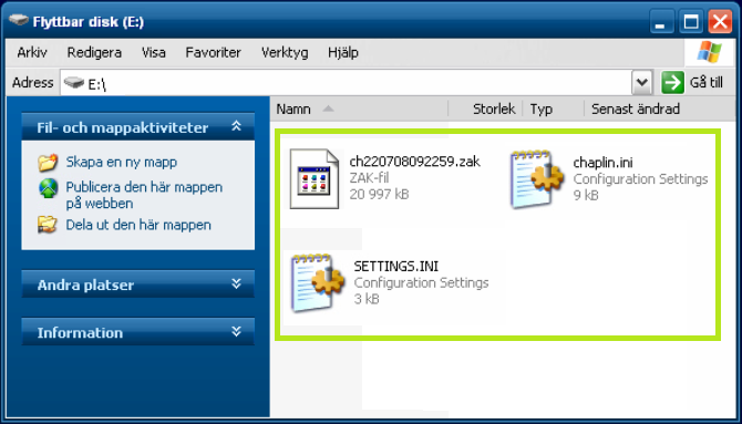 Bläddra fram till filen "chaplin.ini" och kopiera denna på samma sätt som när backupfilen kopierades tidigare. Sök fram USB-minnet eller den externa hårddisken som tidigare i guiden och klistra in filen där.