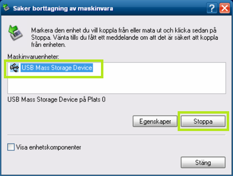 Innan enheten tas ut från datorn bör den kopplas från med säker frånkoppling.