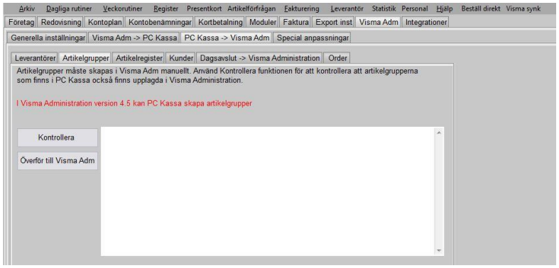 Öppna kassaprogrammet på den dator som har Vismasynken och gå till Arkiv- Inställningar - Företagsuppgifter - Visma Adm - PCKassa -> Visma Adm - Artikelgrupper. Klicka på "Kontrollera" för att se ifall någon artikelgrupp saknas. Kommer det upp någon artikelgrupp i rutan så klicka på "Överför till Visma Adm" Prova sedan att gå in under "Tidigare Dagsavslut" och dubbelklicka på den aktuella vita/röda raden "Skapa Dagsavslut i SPCS" på nästa följdfråga trycker ni "NEJ".