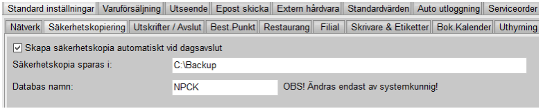 Säkerhetskopia sparas i: Sökvägen till mappen där man sparar säkerhetskopiorna. Mappen bör ha fulla "rättigheter". Mappen behöver finnas då kassaprogrammet inte själv kan skapa denna mapp.