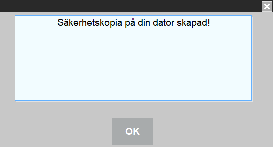 Backupfilen är lösenordskyddad och kan enbart öppnas för eventuell inläsning av supportavdelningens tekniker.
