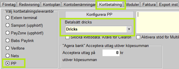 Därefter behöver bara betalsätt för Drickshantering väljas i rullistan i PP-inställningar.