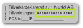 Tillverkningsnummer är ett unikt nummer för varje säljande kassa och levereras tillsammans med kassaregistren i form av fysiska etiketter som ska fästas på kassadatorn. Detta tillverkningsnummer använder butiksansvarig när kassaregistret registreras hos Skatteverket i samband med att kassasystemet sätts i drift. Etiketterna innehåller bland annat information som berör tillverkardeklarationen. Då det finns mängder med olika kassamodeller, likväl som att etiketten blivit fäst antingen av er själva eller kassainstallatören, kan själva fästplatsen skilja. Leta efter en etikett som ser ut som på bilden nedanför.