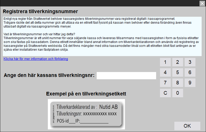 Innan det går att registrera tillverkningsnummer digitalt behöver kassaprogrammet uppdateras. När kassaprogrammet är uppdaterat går det sedan bra att ange tillverkningsnumret under kassans systemuppgifter. Ett unikt tillverkningsnummer ska anges för varje säljande kassa. Om detta inte anges kommer ett påminnande fönster automatiskt öppnas vid uppstart varje måndag fram tills att tillverkningsnumret är angivet. Det är upp till er själva att säkerställa att tillverkningsnummer anges och registreras korrekt på samtliga säljande kassaterminaler.