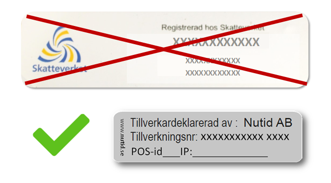 OBS! Saknas denna etikett måste en ny beställas samt en ny registrering av kassaregistret utföras via Skatteverkets webbplats, se mer om detta längre ner.