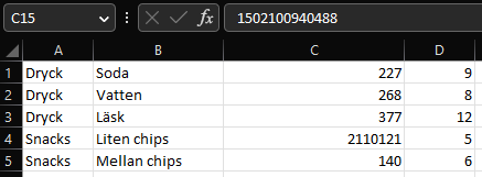 Detta ger följande resultat: Namn;Moms;Momskonto. Öppnar man det i Excel så blir kolumn A artikelgruppens namn, kolumn B blir momssatsen och kolumn C blir momskontot.