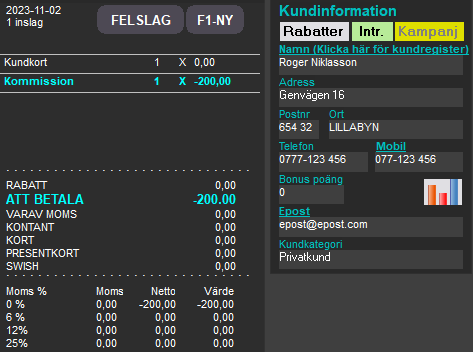 OBS! Sedan 2021 ska man alltid undvika att systematiskt utföra utbetalningar till kunders och kommittenters betalkort då butiken kan spärras genom kortleverantörens transaktioner på grund av misstänkt penningstvätt. Undersök de regler och eventuella undantag som gäller din butik för systematiska utbetalningar till kunder. Se vidare för hur utbetalning kan registreras i kassan mot till exempel bankkontoutbetalning.