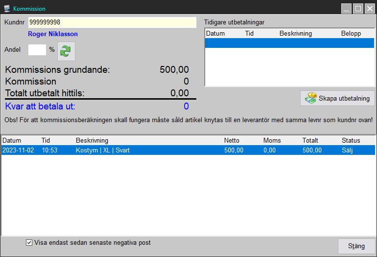 Kommissionsfönstret visar i den nedre halvan en lista över de artiklar som är sålda som kommissionsgrundande från den valda kommittenten samt presenterar även summan över det kommissionsgrundande beloppet som i exemplet är 500kr.