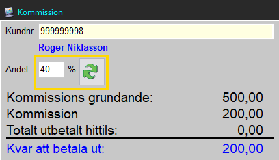 Fyll i andel i procent och tryck på knappen med två gröna pilar för att visa en uträkning över hur mycket som är kvar att betala ut till kommittenten.