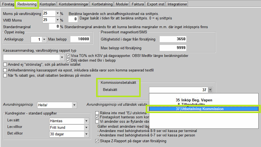 Ange i rullistan under valen för Kommissionsbetalsätt det betalsätt som ska belastas vid utbetalning av kommission. Välj det betalsättet som skapades ovan.