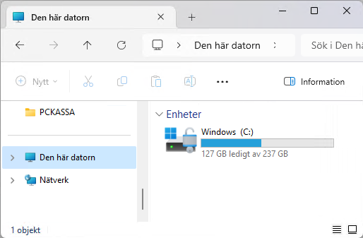 På höger sida listas enheter som finns i datorn. Här ser vi "Windows (C:) som enda enhet men USB-minnen kan finnas listade med. Namnet "Windows" är för att det ska vara lätt att känna igen men det vikta är enhetsbeteckningen C: och alla anslutna enheter får en egen bokstav. I våra guider hänvisas till denna enhetsbokstav.