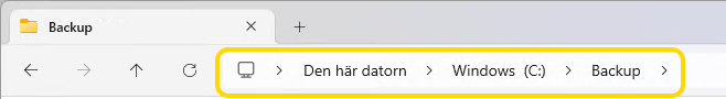 Där ser man var man befinner sig i katalogstrukturen. Om man klickar till höger om sista pilen (Backup >) så visas det i stället som en adress:
