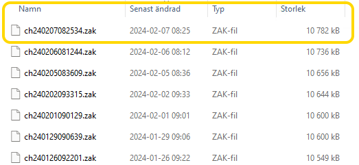Kolumnen "Typ" visar vilken filtyp som avses. I denna bilden "ZAK-fil". Andra vanliga typer är "Textfil", "Excel" med flera.