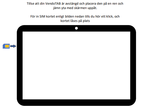 Det är väldigt viktigt att SIM kort sätts i på rätt sätt i plattan. Sätts SIM kort i på fel sätt kan det vara extremt svårt att få ut det igen, och det kan även skada SIM-korts slotten. Se bild nedan för korrekt tillvägagångsätt. Finns även som PDF. SIM kortet styrs via programmet VendoSim, som startas automatiskt. SIM kort utan PIN kod rekommenderas.