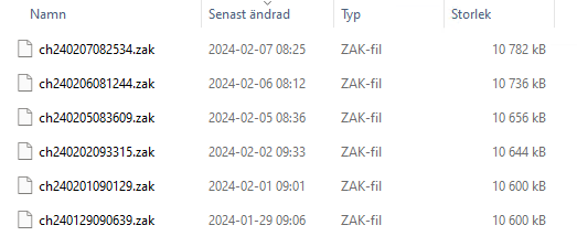 Här kan det finnas två typer av filer, ZAK- och BAK-filer. Båda är backuper från kassan och går att tas bort. Behåll alltid den senaste om det går (kolla kolumnen Senast ändrad) men radera resten permanent.