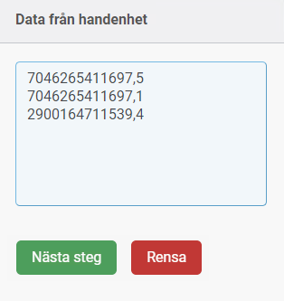 När man är klar med inläsningen från skannern trycker man på denna knapp. Fältet ”Data från handenhet” rensas och förs in i listan ”Artikelrader att hantera”. Den ersätter informationstexten i bilden ovan.