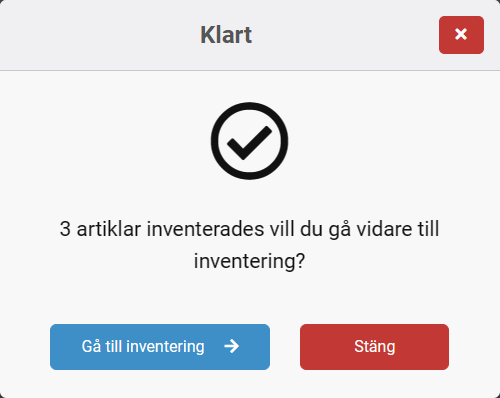 9. Klart. Nu visas en fråga om man vill gå till inventeringen. Observera att man nu är klar med listan och denna har förts över till inventeringen. Man är alltså inte klar med inventeringen.