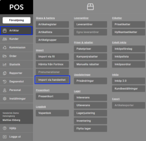 För att skapa en lista från inventeringsskannern, gå via menyn ”Artiklar” och tryck ”Import via handenhet”.