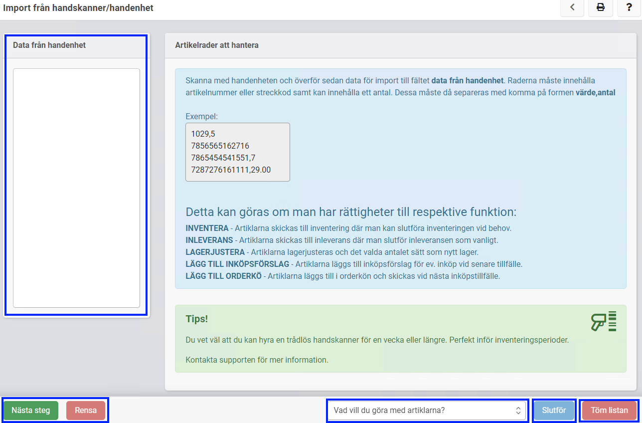 Förklaring av funktionen Import från handskanner/handenhet