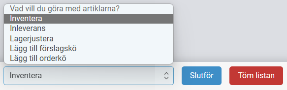 7. När alla artiklar är inlästa och kontrollerade så ska listan föras över till inventeringen. Välj ”Inventera”.