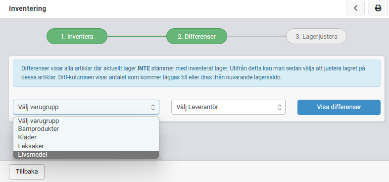 Gå igenom differenslistan för de varor som inventerats (hoppa över övriga om det inte är så att det är någon av dessa som missats att inventeras). Knappen ”Tillbaka” tar dig bort från differenslistan och du kan komplettera inventeringen. När allt är till belåtenhet, tryck på knappen ”Lagerjustera”.