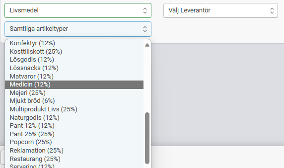 Här väljer man den varugrupp eller leverantör man vill kontrollera, Livsmedel i detta exempel. Då visas ett val för att välja artikeltyper. Om man väljer en artikeltyp så kommer bara den att visas.