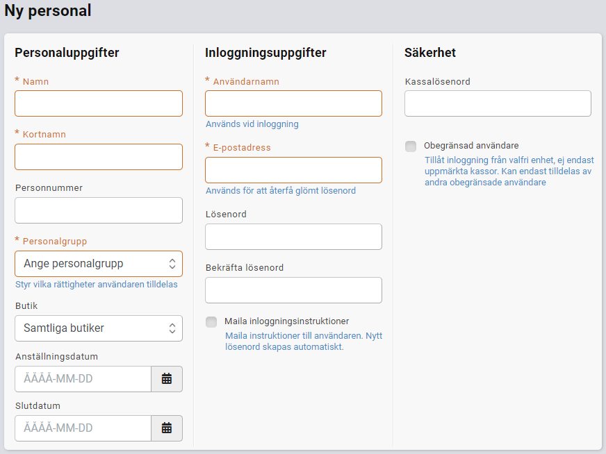 Namn, Kortnamn, Personalgrupp, Användarnamn samt E-postadress måste fyllas i. Kryssar man i att mejla inloggningsinstruktioner så behöver man inte fylla i något lösenord. Annars måste det göras.